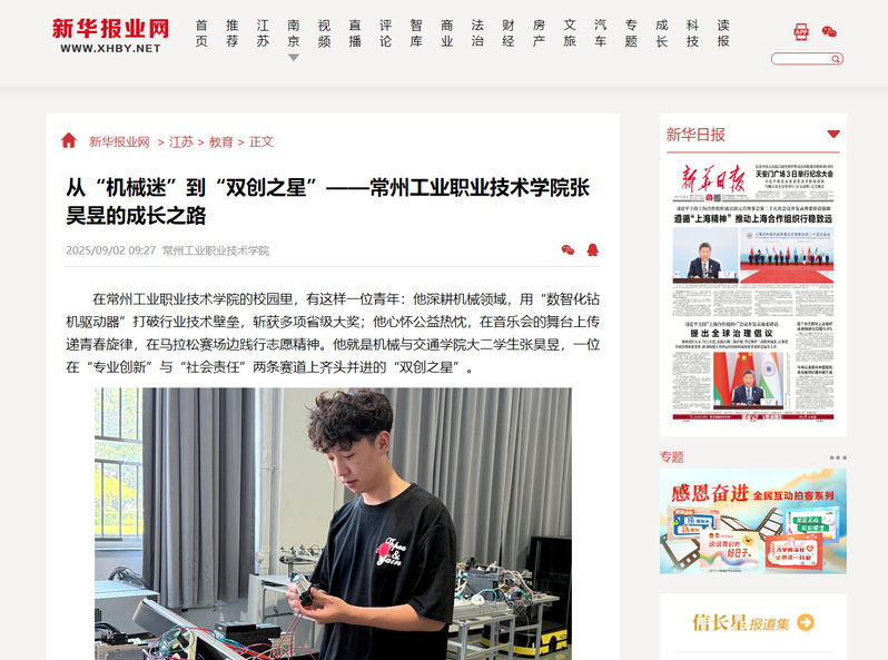 新华报业网:从“机械迷”到“双创之星”——常州工业职业技术学院张昊昱的成长之路