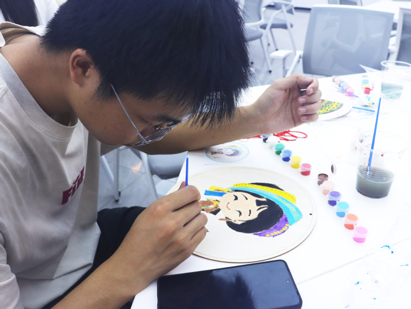 在民族风主题挂饰制作环节,同学们充分发挥创意,先在圆形木盘上精心绘制各族人物画像,然后系上亲手编织的中国结,组装成独具特色的民族团结主题挂饰,每个挂饰都展现一个民族的特色服饰和文化符号。“此次活动十分有新意,不仅让我提升了绘画技能,更深入了解了各民族的文化特色。”参加活动的土家族学生杨鑫宇在展示作品时说道。