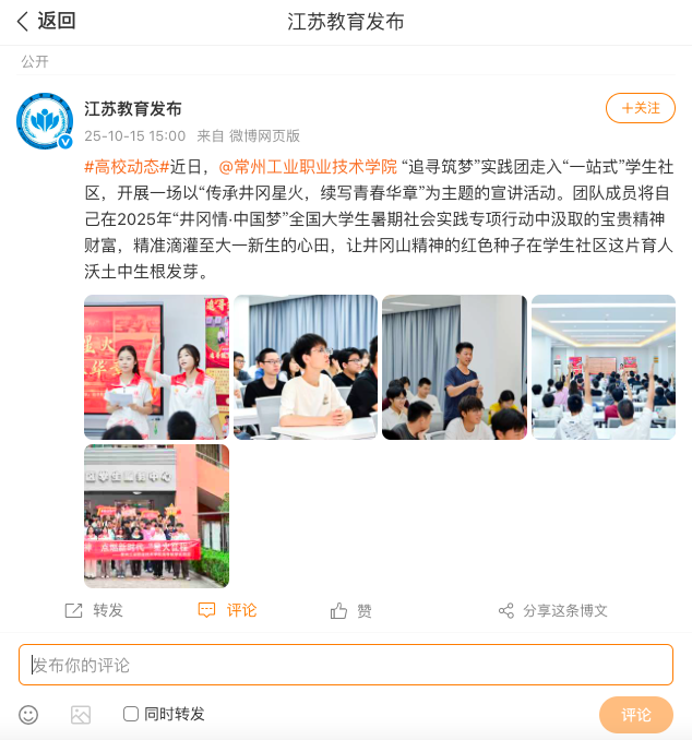 江苏教育发布:#高校动态#常州工业职业技术学院“追寻筑梦”实践团开展主题宣讲活动