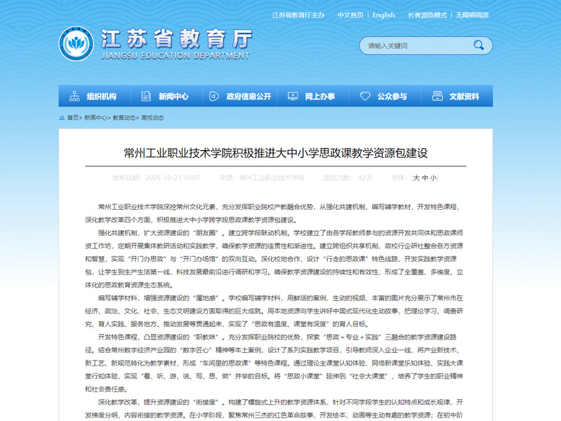 江苏省教育厅:常州工业职业技术学院积极推进大中小学思政课教学资源包建设