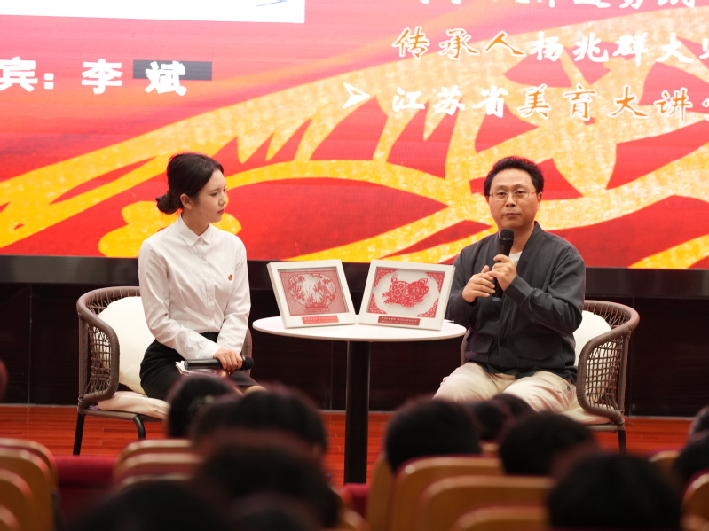 在“对话·匠心之源”现场访谈环节,江苏省职业教育剪刻纸数字化技艺技能传承创新平台负责人、艺术创意学院专任教师李斌分享了非遗教学与实践中的故事。他提到,学校已将金坛刻纸纳入美育课程,开发《一刀一纸一世界》教材,通过“师徒结对”计划每年惠及近1.5万人次,培养专业人才近2500名;艺术创意学院非遗志愿服务团还走进社区、中小学开展体验活动,线上线下累计受益超2万人次,项目荣获“江苏省优秀青年志愿服务项目”等荣誉。