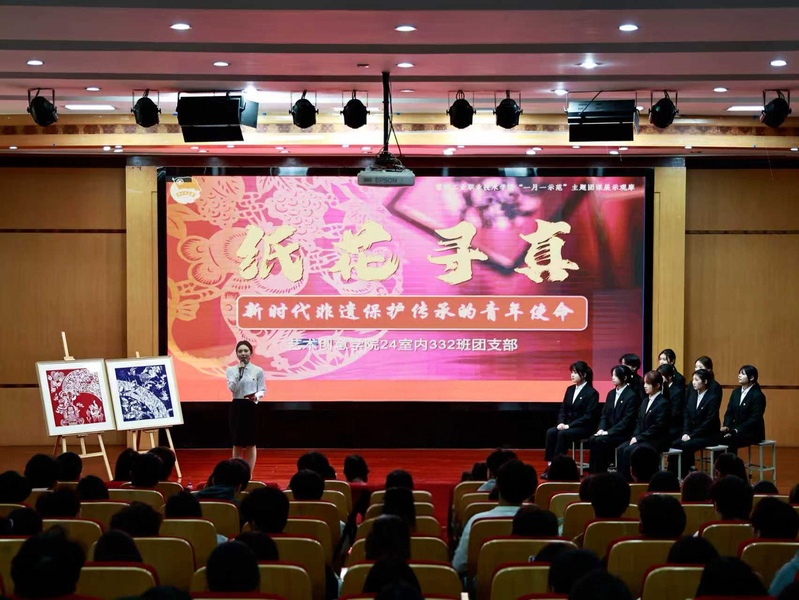 10月29日,艺术创意学院“一月一示范”主题团课如期举行。校团委副书记涂艳群,各二级学院分团委书记以及全校团支部书记、新团员代表齐聚一堂,共同聆听“纸花寻真——新时代非遗保护传承的青年使命”主题团课,在金坛刻纸的匠心传承与创新实践中,探寻青年一代的文化担当与传承之道。