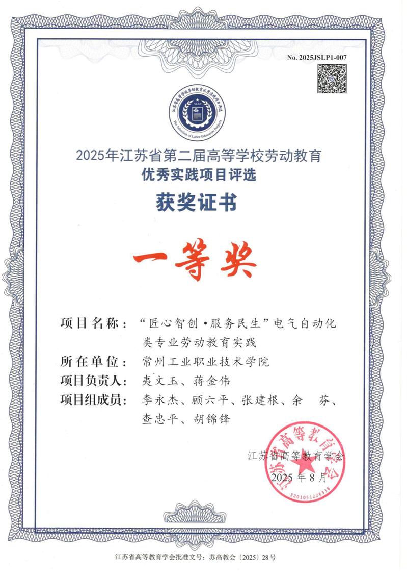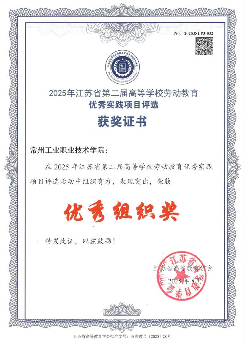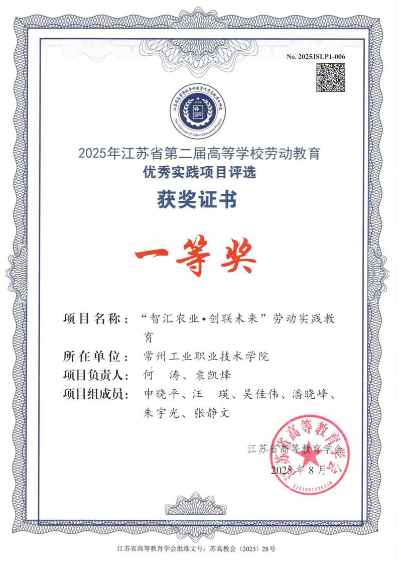 近日,江苏省高等教育学会2025年高等学校劳动教育优秀实践项目评选结果出炉,我校信息工程学院何涛、袁凯烽, 智能控制学院夷文玉、蒋金伟的项目获一等奖,机械与交通学院冯莉的项目获二等奖。同时,我校获评江苏省第二届高等学校劳动教育优秀实践项目评选活动优秀组织奖。