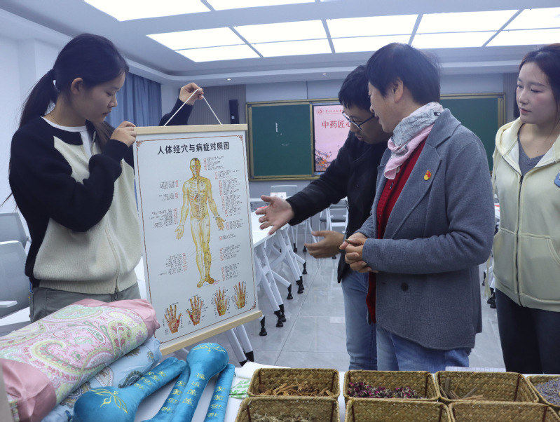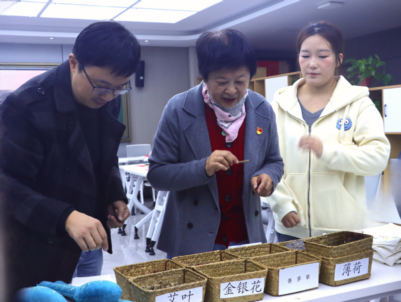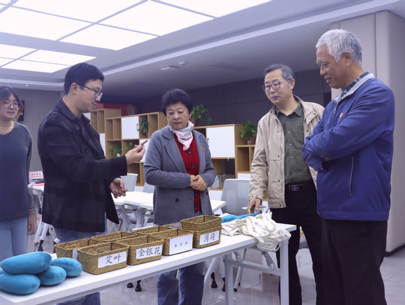 活动现场,本草社学生向三位老同志展示了自主研发的中药养生锤、中药枕、中药香皂和艾草贴等文创产品。学生结合人体经络图,详细讲解了艾草、薰衣草等药材的配伍原理及功效,现场演示穴位按摩手法。张燏试用中药养生锤后,对学生的创新设计给予高度评价:“将传统药材与现代工艺结合,既弘扬了中医药文化,又体现了青年学子的实践智慧。”金华仁赵吕明还与学生互动体验了辨识药材、调配药材比例等环节,感受“药食同源”的文化魅力。三位老同志分别与家庭困难学生结对帮扶,现场互留联系方式三位老同志结合自身经历,勉励学生扎根专业、服务社会。