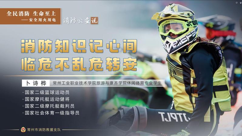 卜诗桦自入学以来,始终深耕水上摩托艇运动领域,凭借日复一日的刻苦训练与对运动事业的执着追求,在国家级赛事中屡创佳绩,并获评国家摩托艇运动健将。2023年中国摩托艇精英赛中,她斩获女子坐式水上摩托RL3竞速赛第八名;同年全国摩托艇锦标赛上,她不仅夺得女子坐式水上摩托RL3竞速赛第七名,更在RS3竞速赛与障碍回旋赛中双双拿下第六名,以亮眼成绩成功入选国家摩托艇青年集训队。赛场之外,卜诗桦积极参与校园公益活动,从体育技能公益教学到社区志愿服务,始终以实际行动践行“奉献、友爱、互助、进步”的志愿精神,与常州市消防救援支队倡导的“全民参与、共筑平安”消防宣传理念高度契合。