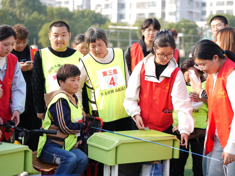 本届趣味运动会精心设置了轮椅投篮、轮椅竞速、飞盘九宫格、盲人夹弹珠、趣味保龄球、旱地冰壶、定点钓鱼等十个项目,兼具趣味性与竞技性。比赛中,志愿者们一对一结对帮扶残障人士,细致守护运动安全,还携手组队完成团体项目,让残健融合的温暖画面贯穿全程。