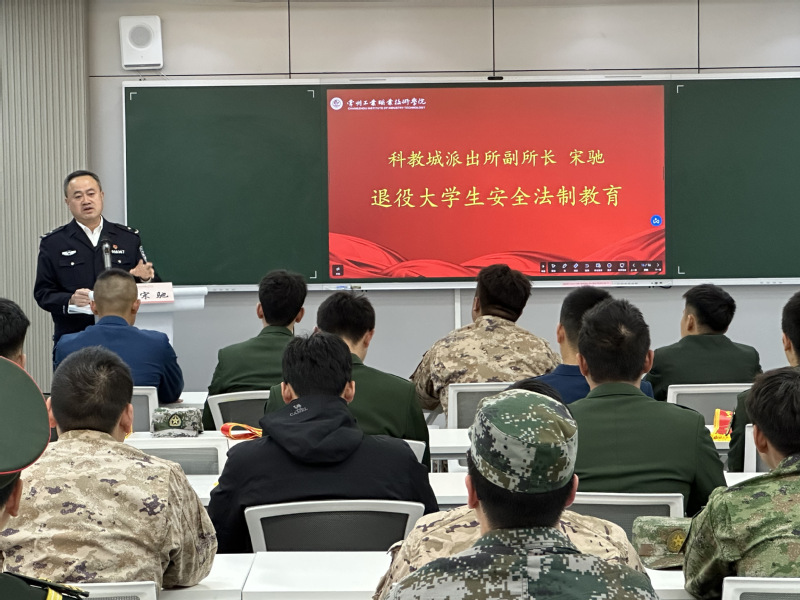 在退役士兵安全法治教育大会上,学校特邀科教城派出所副所长宋驰警官开展退役士兵安全法治教育宣讲。宋警官围绕防范网络电信诈骗、大学生人身财产保护等常见安全问题,结合真实案例进行深入剖析。他提醒退役学生保持军人的敏锐性和纪律意识,警惕各类新型诈骗手段,主动学习安全知识,积极参与平安校园建设。宣讲既有法律知识普及,又有实操技巧传授,为退役学生尽快适应校园生活提供了实用指导。