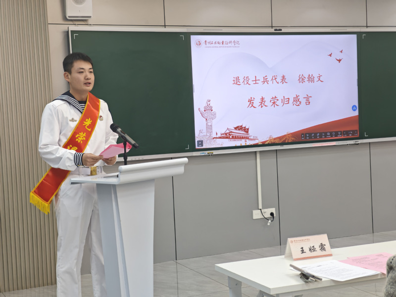 退役士兵代表徐翰文同学在发言中感恩军队的培养和学校的关怀,他追忆自己作为中国人民解放军海军一员的峥嵘岁月,分享了复学后以军营精神攻克学业、践行“脱下军装,本色不变”的经历。