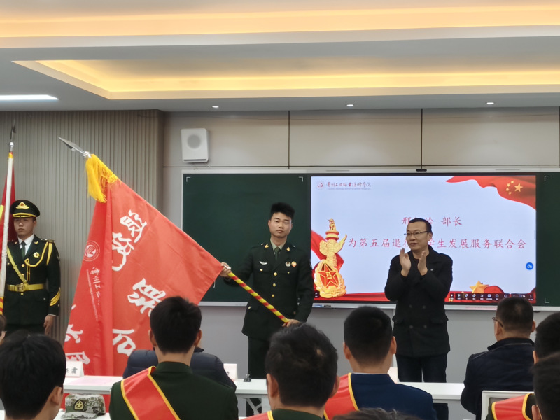 大会还举行了退役大学生发展服务联合会换届仪式。邢凯岭向第五届退役大学生发展服务联合会基干成员授旗。人武部专武干部袁伟民老师宣读了《关于表彰第四届退役大学生发展服务联合会工作先进个人的通知》,并为获表彰的同学颁奖。综合教育科科长张帅宣读了《关于任命退役大学生发展服务联合会第五届基干成员的通知》,并为新任基干成员颁发聘书。联合会第五届主席团主席刘森作就职发言,18位新任基干成员进行集体宣誓。