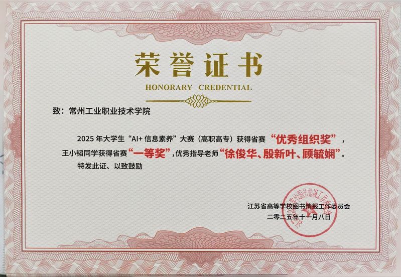 12月5日,从图书馆传来喜讯,在近日举办的2025年江苏省大学生“AI+信息素养”大赛(高职高专赛道)中,我校24人工智能现场工程师班学子王小韬凭借精准的检索策略、娴熟的生成式AI工具运用及稳健的临场发挥荣获一等奖,徐俊华、殷新叶、顾毓娴获评“优秀指导老师”,学校获“最佳组织奖”。