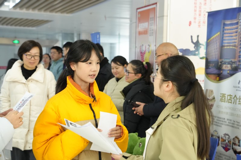 招聘现场,各企业通过摆放宣传展板、发放招聘手册、现场宣讲等形式,向求职学生详细介绍了企业的发展历程、企业文化、岗位设置及人才培养计划。同学们手持精心准备的简历,有序穿梭于各个展位之间,主动与企业招聘负责人交流沟通。他们围绕岗位需求、实习内容、职业发展前景、薪资待遇等问题积极提问,展现出扎实的专业素养和饱满的求职热情。常州文璞酒店、张家港华芳金陵酒店等企业负责人也纷纷表达了深化合作的意愿,期待建立长期稳定的人才输送渠道。