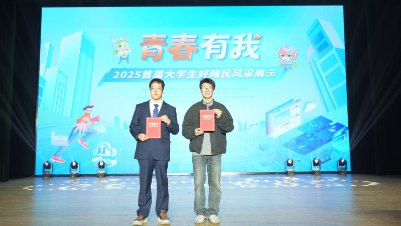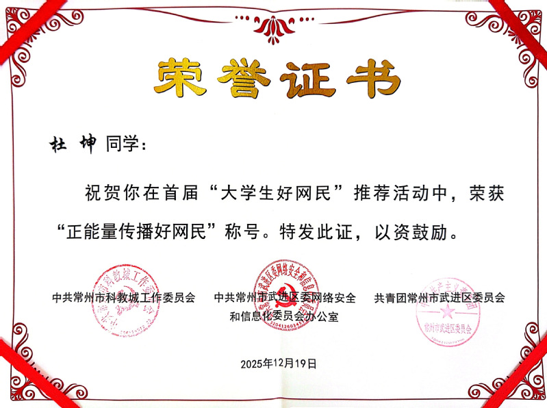 12月19日,由常州市委网信办、常州科教城党工委、武进区委网信办、武进团区委联合主办的“青春有我”2025首届大学生好网民风采展示活动在常州大学西太湖校区圆满落幕。我校旅游与康养学院杜坤、信息工程学院彭云翔两位同学脱颖而出,分别获评“正能量传播好网民”与“公益服务好网民”,充分展现了我校学子积极健康、向上向善的网络正能量形象。