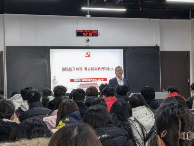 12月17日,党委副书记、校长王志华深入2024级旅游专业课堂,以“学习党的二十届四中全会精神”为题,为同学们讲授了一堂主题鲜明、内涵深刻的专题思政课。王志华从党的二十届四中全会的历史方位与时代意义切入,深刻阐释了“十五五”时期在全面建设社会主义现代化国家进程中的关键意义。他系统解读了规划的战略背景、核心原则与实施路径,通过辨析“计划”与“规划”的时代内涵,引导学生领悟党和国家治国理政的系统思维与战略主动。他鼓励学生立足专业、胸怀大局,深刻认识中国式现代化的宏伟蓝图与实践路径,自觉将个人学业与职业规划融入国家发展浪潮,在以中国式现代化全面推进中华民族伟大复兴的征程中,找准方位、担当使命、实现价值。