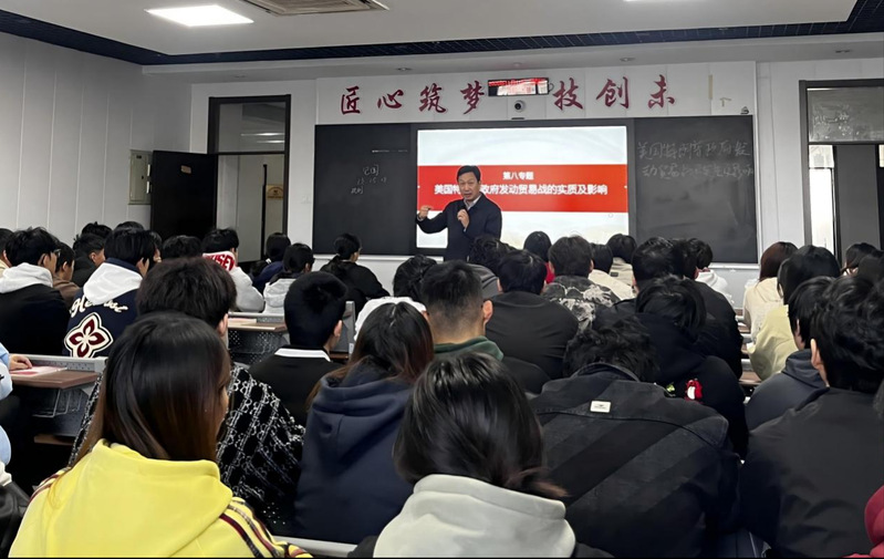 11月11日,党委委员、副校长姚庆文为2024级计算机网络专业学生讲授“美国特朗普政府发动贸易战的实质及影响”专题思政课。姚庆文从美国政治体制与对外行为的特点切入,聚焦特朗普政府发动的对华贸易战,通过对比分析,深刻揭示美国以“公平贸易”为名、行单边保护之实的实质,阐明对华贸易战对中美两国乃至全球经济产生的深远影响,勉励学生清醒认识国际形势的复杂性,树立正确历史观、大局观,坚定“四个自信”,将个人成长融入国家发展大局,勤学笃行、奋发有为,为实现中华民族伟大复兴贡献智慧与力量。