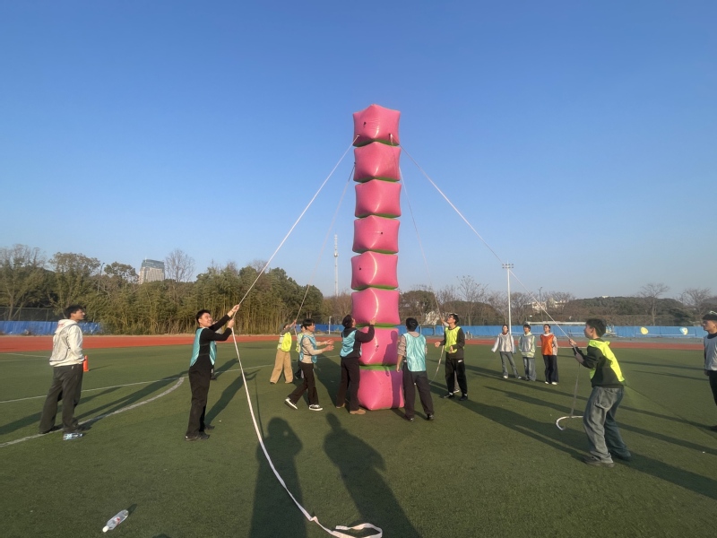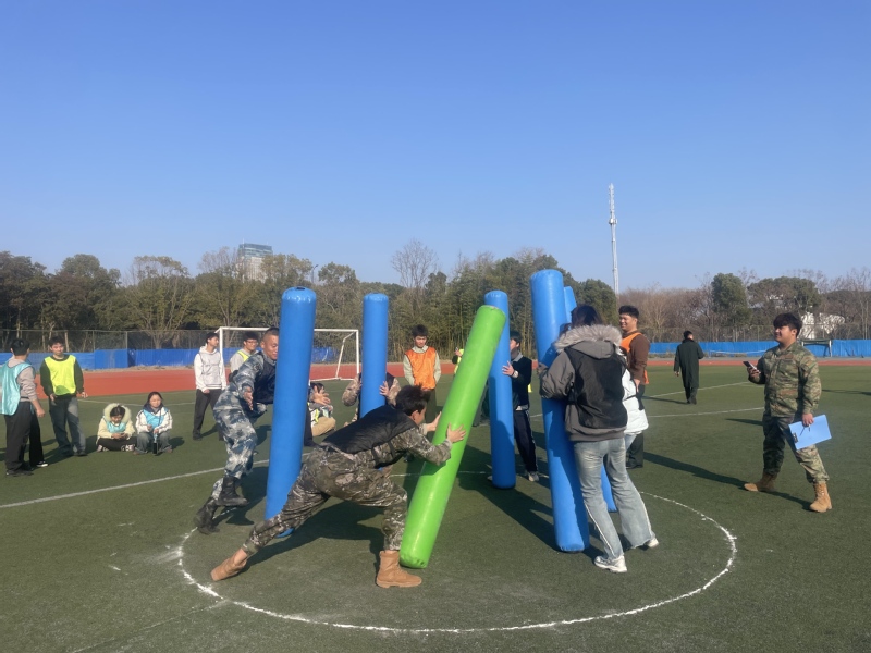 室外赛场上,各项趣味赛事竞争激烈。选手们沉稳发挥,为团队奋力拼搏。“陆地龙舟接力赛”中几组队员步调一致,奋力争先;“不倒森林”中,各参赛队依令迅速转动手中道具,现场加油声不断;“步步高升”中同学们奋力垒出“人生”新高度;“超级障碍赛”环节退役大学生与国护队队员分两组,翻越各种障碍,接力冲刺,现场观众呐喊助威,气氛热烈。