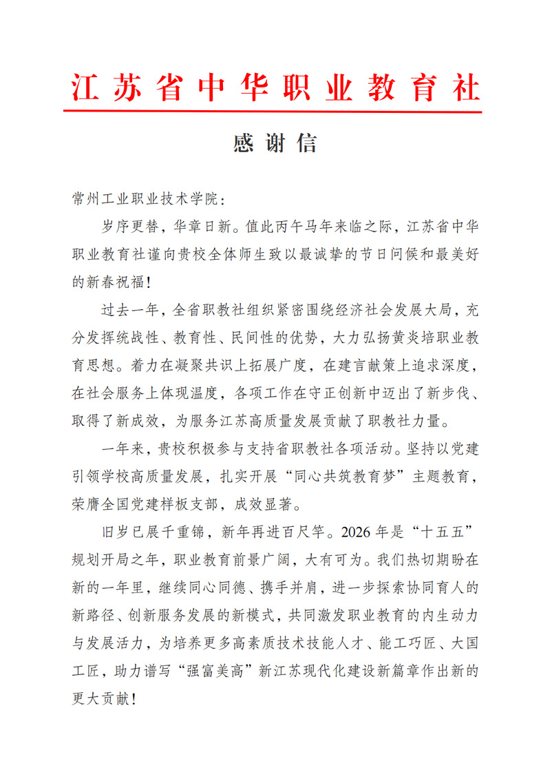 2月12日,江苏省中华职业教育社向我校发来感谢信,对我校在2025年对省职教社工作的支持以及为职业教育发展所做出的贡献表达了诚挚谢意。