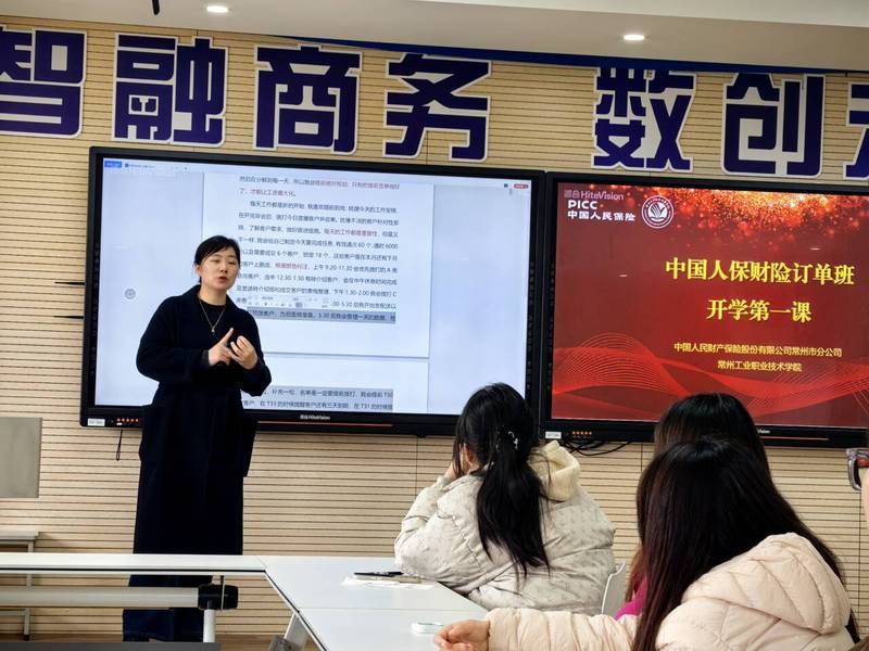 3月30日,数字商务学院金融服务与管理专业“中国人保财险订单班”迎来了开班第一课。人保财险常州市武进支公司团队经理、订单班导师陈丽走进校园,为订单班同学带来了一场内容丰富、案例生动的专题讲座。此次课程开班标志着订单班人才培养工作全面启动,校企协同育人迈入实质性阶段。