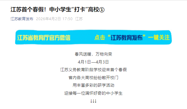 江苏教育发布:江苏首个春假!中小学生“打卡”高校①