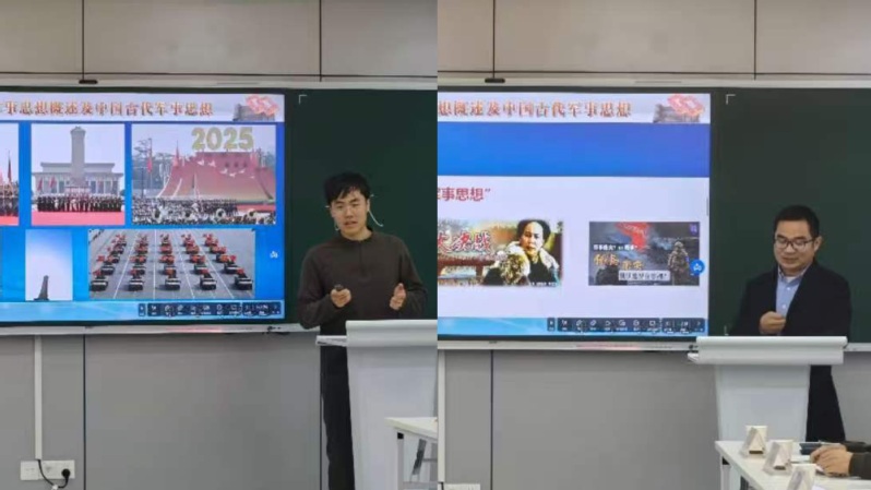 在随后举行的军事理论教研室2025-2026第2学期第5期教研活动暨集体备课会上,与会教师首先学习了习近平总书记在参加首都义务植树活动时的重要讲话精神中关于青少年德智体美劳全面发展以及与课程“总体国家安全观”中生态安全领域相关的重要论述。随后,军事理论课第七讲“军事思想概述及中国古代军事思想”备课小组代表兰相波、顾永振展示了合作备课成果,各备课小组围绕备课工作展开深入研讨交流,景宝华、李昆益、王风圳、周娟等老师分别从教学规范、教学资源、教学手段、学生参与和师生互动等方面对军事教师合作备课情况进行了点评和指导。