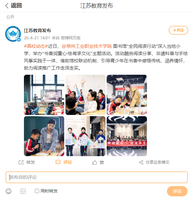 江苏教育发布:#高校动态# 常州工业职业技术学院图书馆深入小学举办阅读活动