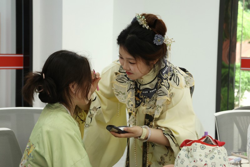 活动现场设置了“汉服妆造·春日花饰”“飞花令·诗词对赛”“刻纸体验”“古风摄影打卡”等多个特色区域。春日花饰体验区中,同学们以簪花、发饰点缀造型,尽显东方审美之雅;飞花令环节以“春、花、水、月、风”为主题展开诗词接龙,参与者妙语连珠、诗意盎然,现场掌声不断。古风摄影区成为人气打卡点,身着汉服的师生在湖畔与草地间定格春日最美瞬间。
