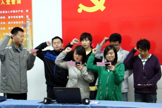 新团员在鲜艳的党旗下接受作为一名团员的使命。组织部部长钟飞同学宣布新团员入团仪式开始,伴随着庄严的中国共青团团歌,组织部潘磊同学带领新团员宣誓,新团员右手握拳上举,用庄严地誓词表明他们坚决拥护中国共产党,遵守团的章程,执行团的决议,履行团员义务,严守团的纪律,勤奋学习,积极工作,吃苦在前,享受在后,为共产主义事业而奋斗的决心。之后,电子系团委组织部部长钟飞同学为新团员颁发了团员证。一张张庄严地面孔,一双双真诚的双眸,一颗颗炽热的真心在那一刻让我们读懂:我坚持中国共产党的领导,坚决服从团组织的安排,认真完成组织分配的任务,服务群众,在奉献中实现自我价值,在学习中实现自我提升。