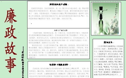 为响应学院廉政建设号召,模具系学生会30日下午在武进区名仕佳园小区进行了一次以“党政廉洁”为主题的宣传活动,主要进行方式是以学生发放廉政故事宣传单为主,主要对象是小区居民,路上行人等。