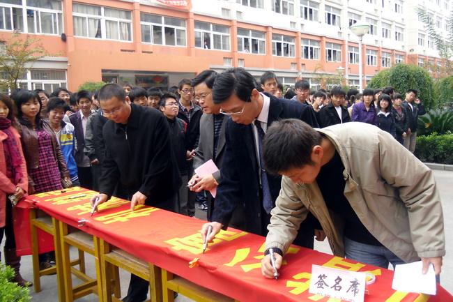 学工处教育管理科科长赵云做了致词,他强调了开展公寓文化活动的重要性,并对本次公寓文化节的开展提出了一些自己的意见和建议。系党总支副书记孙军对本次公寓文化节的活动安排做了详细的介绍和部署。系党总支书记张金兴作了总结,他再次强调了开展公寓文化活动的必要性,要求我们做出自己的特色,他号召广大同学要积极参与进来,为本次公寓文化节取得圆满成功贡献自己的一份力量。最后主席台上的领导和嘉宾在签名横幅上进行了签名。