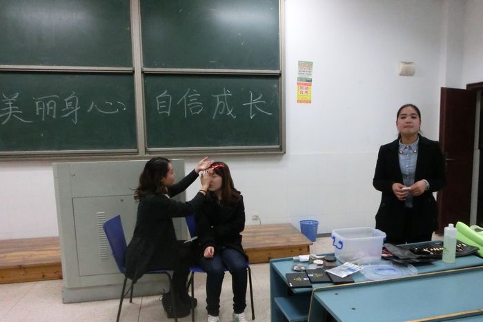 一个得体的形象对于女孩子来说的确越来越重要,未来将要踏上职场的女大学生们掌握基础的化妆技巧是基本的职场礼仪,同时能够化一个简单的通勤妆也能使自己在职场上更加自信。为了满足广大女同学的需要,在三八妇女节到来之际,我系特意邀请了形象专业高年级的同学为大一女生举办了一次化妆知识讲座。讲座结合讲授和现场模特示范,从日常的皮肤护理开始,详细介绍了彩妆之前的科学护肤步骤,即洗面奶、面膜、水、乳以及隔离霜。随后又依次从修眉、画眼线、涂眼影、刷睫毛、上腮红等进行了详细的介绍,同学们边听边学,很多同学还经常提问,整场讲座下来同学们收获很多。略施粉黛而不过分妖媚,让自己更加美丽自信。