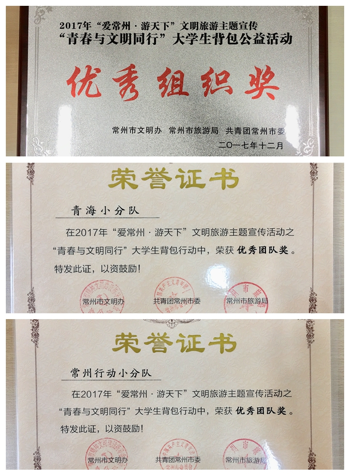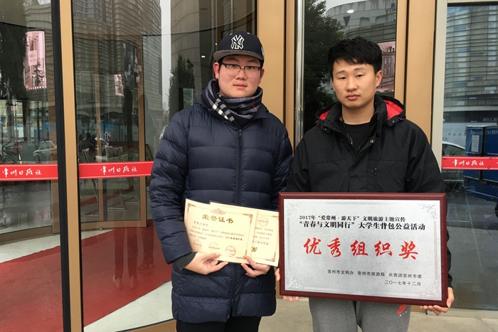 12 月14日,从常州市文明办、团市委、市旅游局传来佳音,我院团委在2017年“爱常州、游天下”文明旅游主题宣传活动暨“青春与文明同行”大学生背包公益活动中荣获最佳团队奖和优秀组织奖。