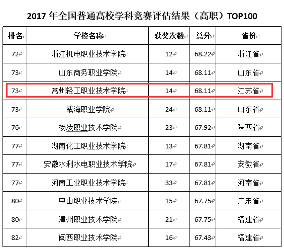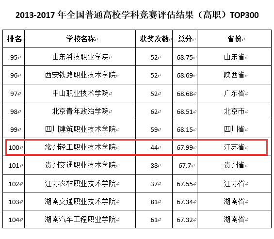 此次学科竞赛方面发布了多个排行榜,高职方面主要是两个“2013-2017年全国普通高校学科竞赛评估结果(高职)TOP300”,“2017年全国普通高校学科竞赛评估结果(高职)TOP100”。在2013-2017年T300榜单,我院列全国高职第100位,江苏高职第13位,在常州高职园区五所院校中排名第三;在2017年TOP100榜单中,我院列全国第73位,江苏高职第九,在常州高职园区五所院校中排名第一。