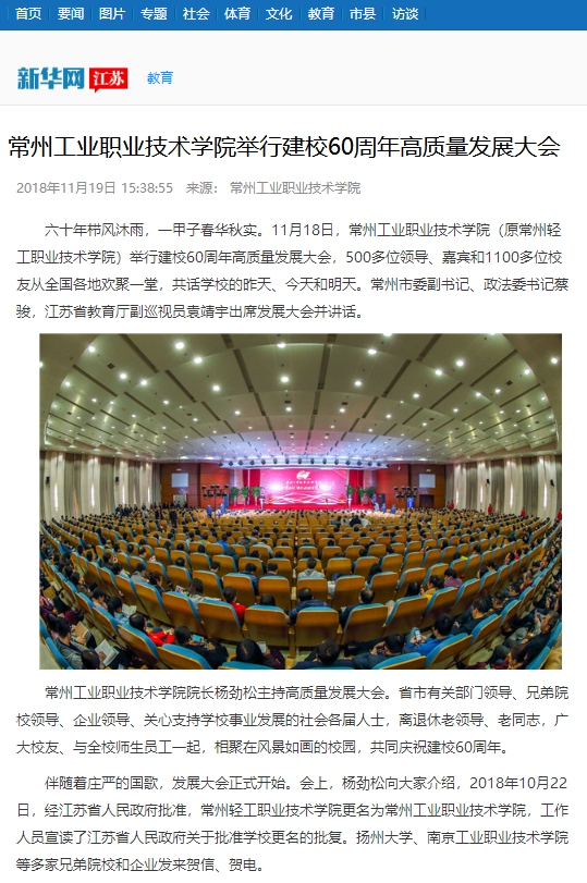 新华网-常州工业职业技术学院举行建校60周年高质量发展大会