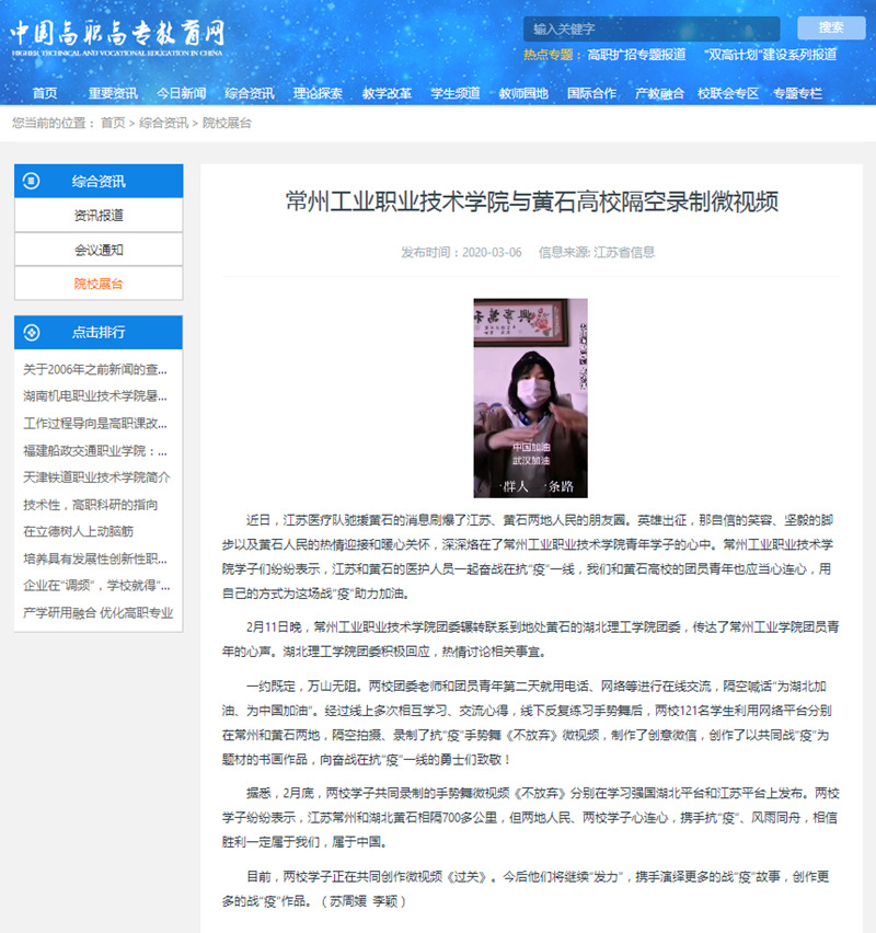 中国高职高专教育网-常州工业职业技术学院与黄石高校隔空录制微视频
