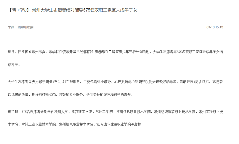 中青在线-常州大学生志愿者结对辅导575名双职工家庭未成年子女