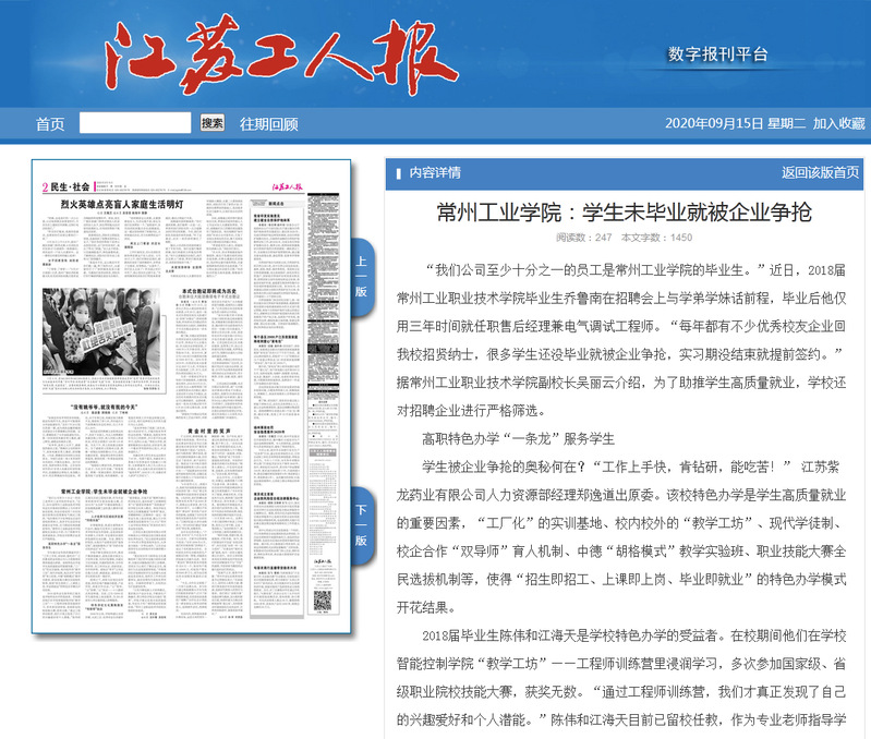 江苏工人报-常州工业学院:学生未毕业就被企业争抢