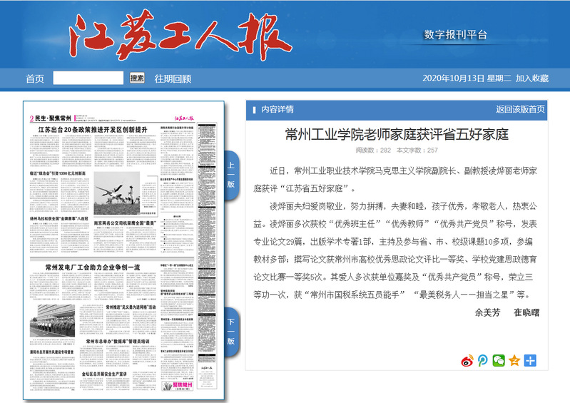 江苏工人报-常州工业学院老师家庭获评省五好家庭