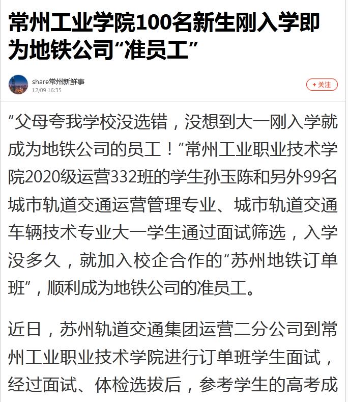 搜狐新闻-常州工业学院100名新生刚入学即为地铁公司“准员工”