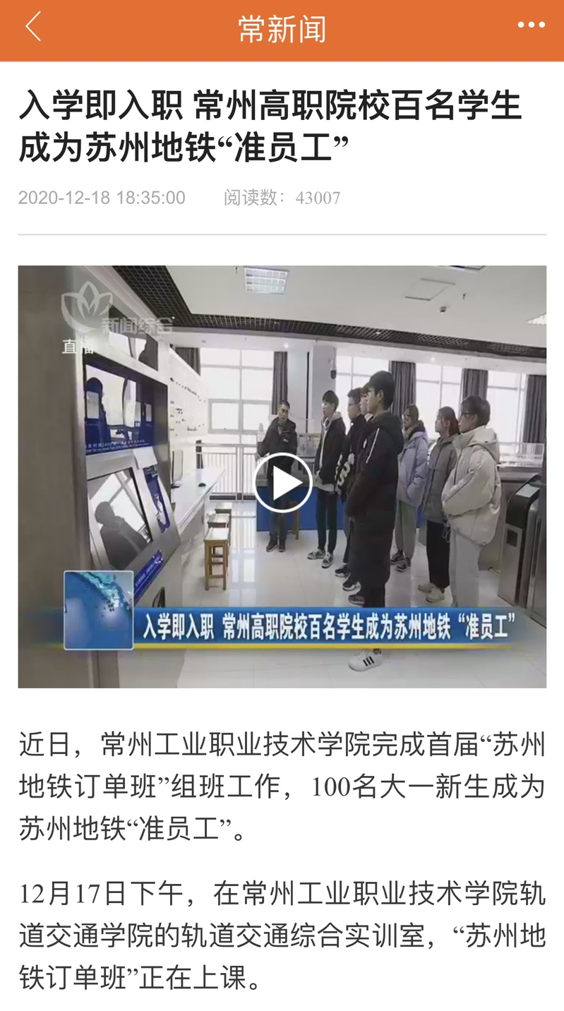 常州电视台-入学即入职 常州高职院校百名学生成为苏州地铁“准员工”