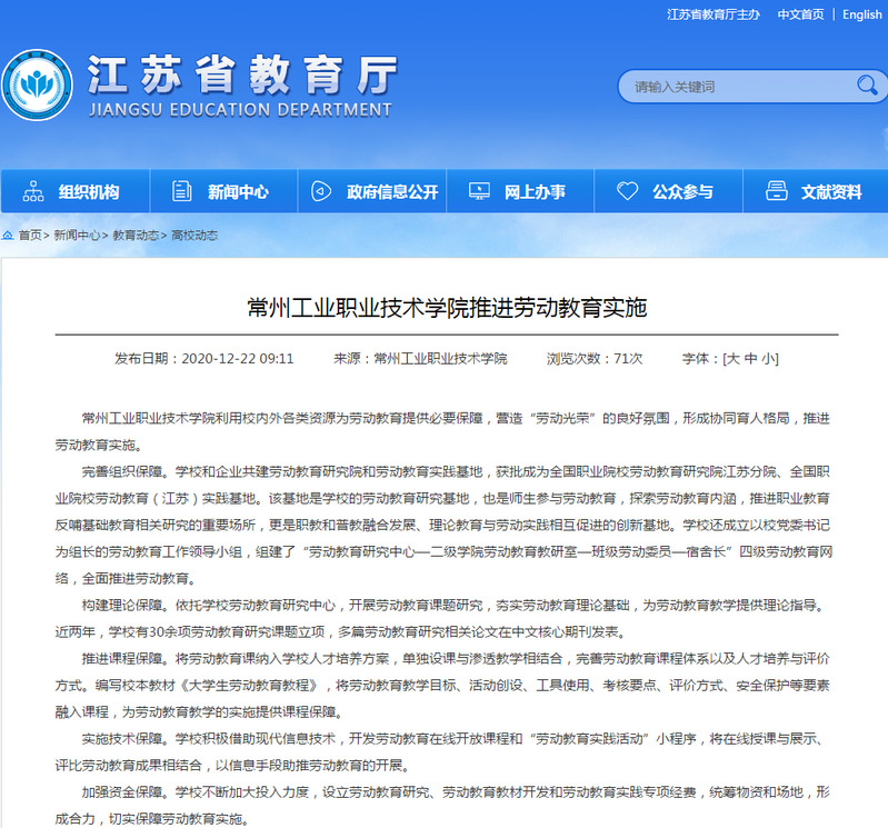 江苏省教育厅-常州工业职业技术学院推进劳动教育实施