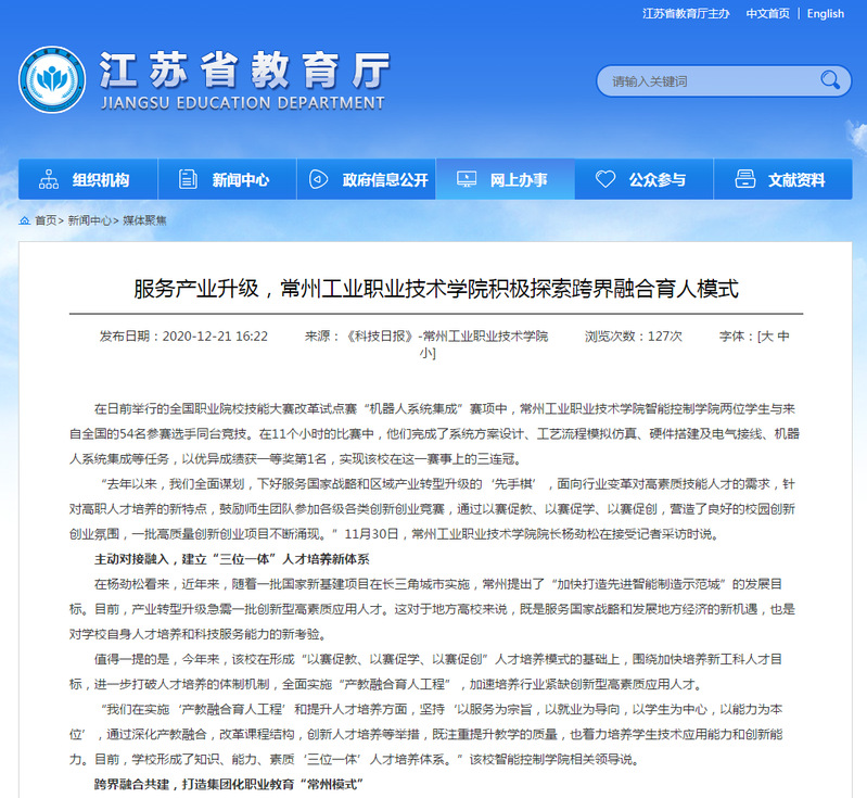 江苏省教育厅-服务产业升级,常州工业职业技术学院积极探索跨界融合育人模式