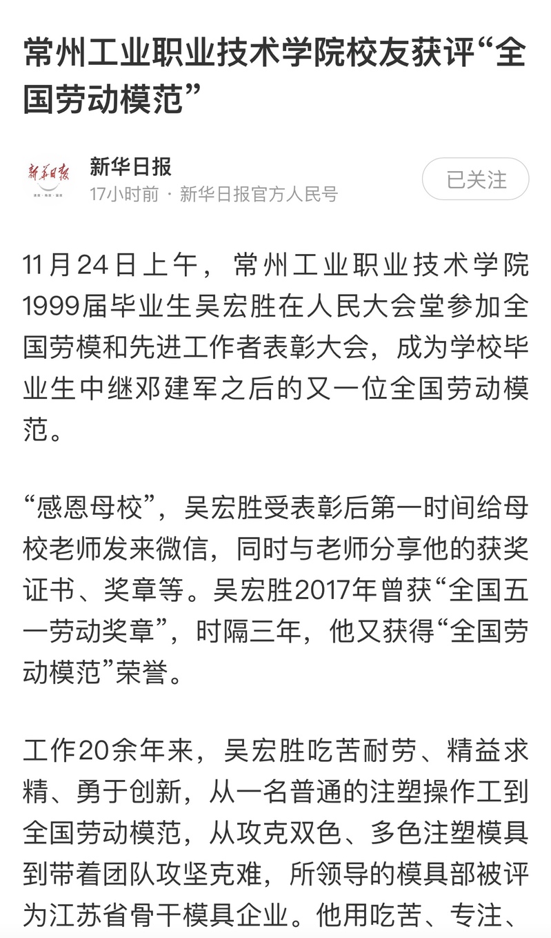 人民日报新媒体客户端-常州工业职业技术学院校友获评“全国劳动模范”
