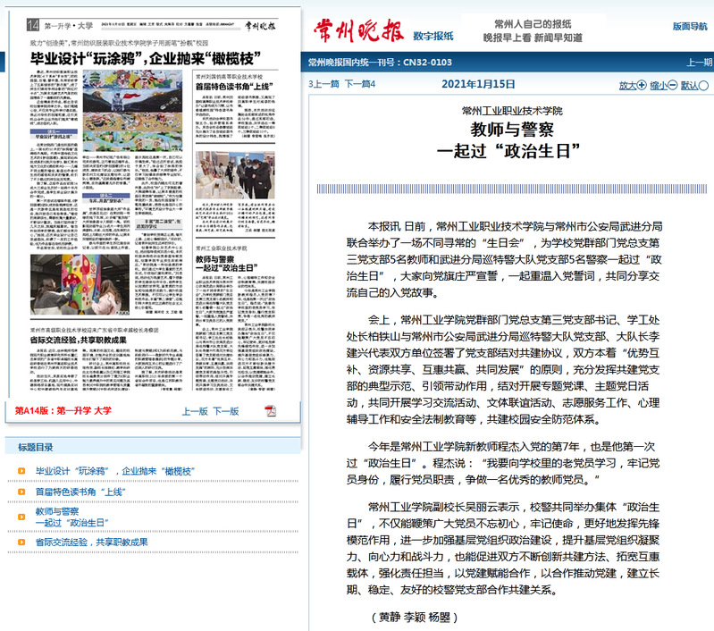 常州晚报-常州工业职业技术学院教师与警察一起过“政治生日”