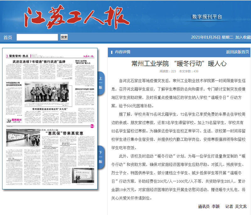 江苏工人报-常州工业学院 “暖冬行动”暖人心