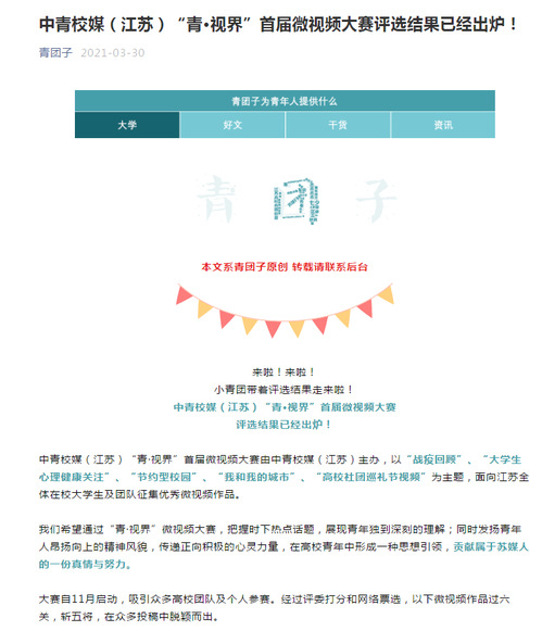 中青在线公众号青团子-中青校媒(江苏)“青·视界”首届微视频大赛评选结果已经出炉!