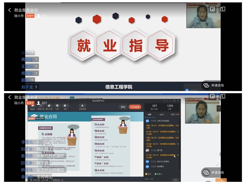为应对当前严峻就业形势,做好毕业生就业工作,加强对我院学生就业的指导与帮助,提升我院学生的就业意识,确定有效的职业发展目标,近日,信息工程学院利用钉钉平台召开2021届毕业生就业指导讲座。此次讲座由信息学院就业辅导员陆小丹主持,信息学院2021届毕业生参加了本次讲座。