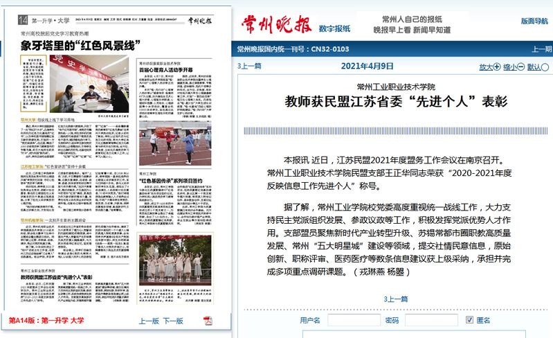 常州晚报-常州工业职业技术学院教师获民盟江苏省委“先进个人”表彰