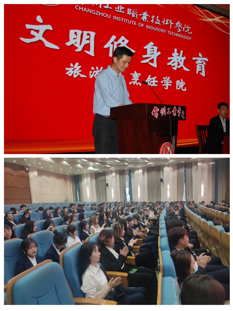 旅游与烹饪学院分团委书记郑新涛,辅导员黄宁、杨天予和全体2019级、2020级在校学生参加讲座。