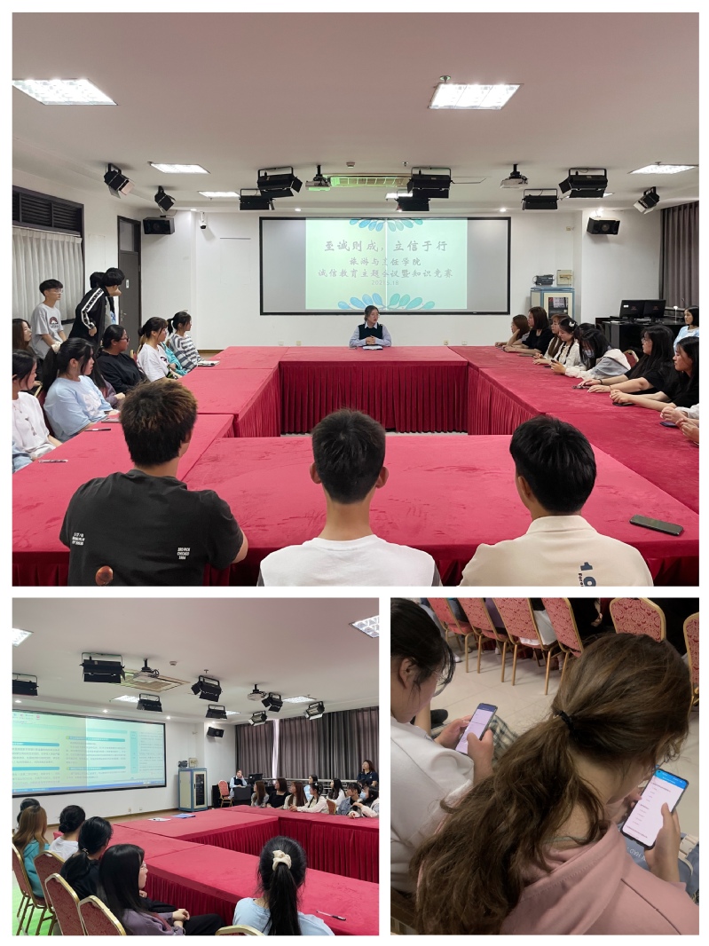为落实立德树人根本任务,增强当代大学生的诚信意识和责任意识,5月18日,旅游与烹饪学院召开以“至诚则成立信于行”为主题的资助诚信教育主题会议暨知识竞赛。会议由旅游与烹饪学院辅导员杨天予主持。