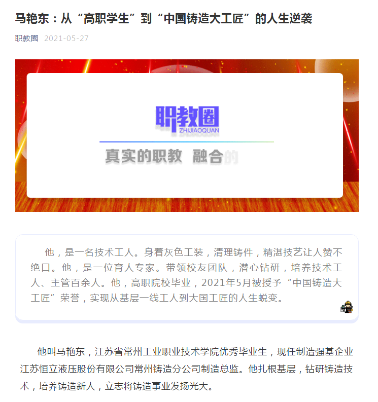 职教圈-马艳东:从“高职学生”到“中国铸造大工匠”的人生逆袭