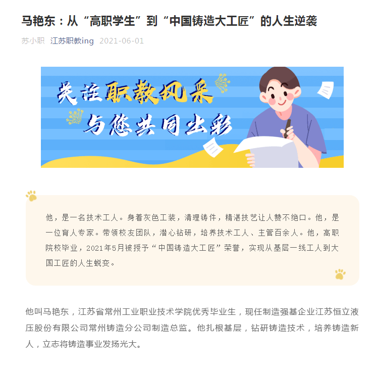 江苏职教ing微信公众号-马艳东:从“高职学生”到“中国铸造大工匠”的人生逆袭